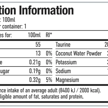 Složení: Voda, taurin, regulátory kyselosti (kyselina citronová, kyselina jablečná, kyselina fosforečná), citrát trojdraselný, chlorid sodný, citrát trojhořečnatý, kokosová voda v prášku, konzervant (sorban draselný), aromata, sladidla (sukralóza, steviol-glykosidy ze stévie).